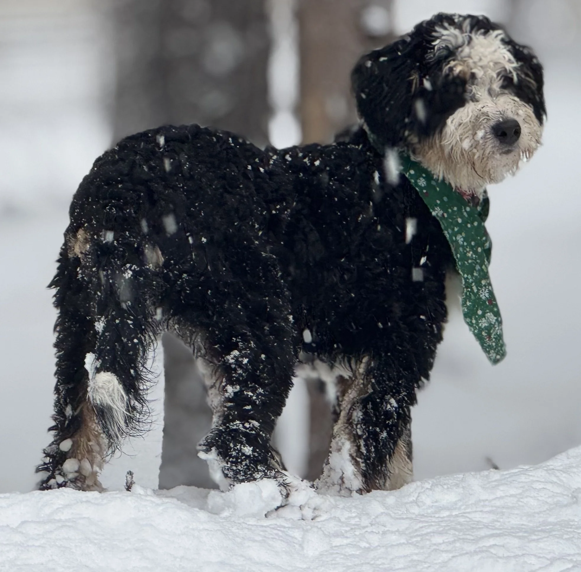 Tiki is a friendly and affectionate mini Bernadoodle with a joyful, playful spirit. She loves fetch, outdoor adventures, and her favorite treats, and balances her excitement with moments of independence and calm. She has minimal-shedding, wavy hair with the gorgeous Bernese tri coloring. Tiki’s loving and confident nature and her stunning exterior makes her a wonderful foundation for our program. We are currently seeking out the best fit fella to sire her litter.